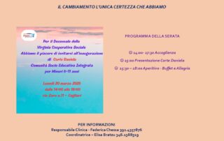 In data 30 marzo 2026 dalle ore 14:00 alle ore 18:00, per il decennale della Virginia Società Cooperativa, inauguriamo a Cagliari, in Via Zara n° 11, la Comunità Socio Educativa Integrata per Minori "Corte Daniela", dedicata a bambini e bambine dai 6 agli 11 anni. Servizio Unico nel territorio regionale per le caratteristiche metodologiche.